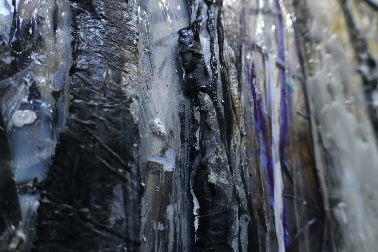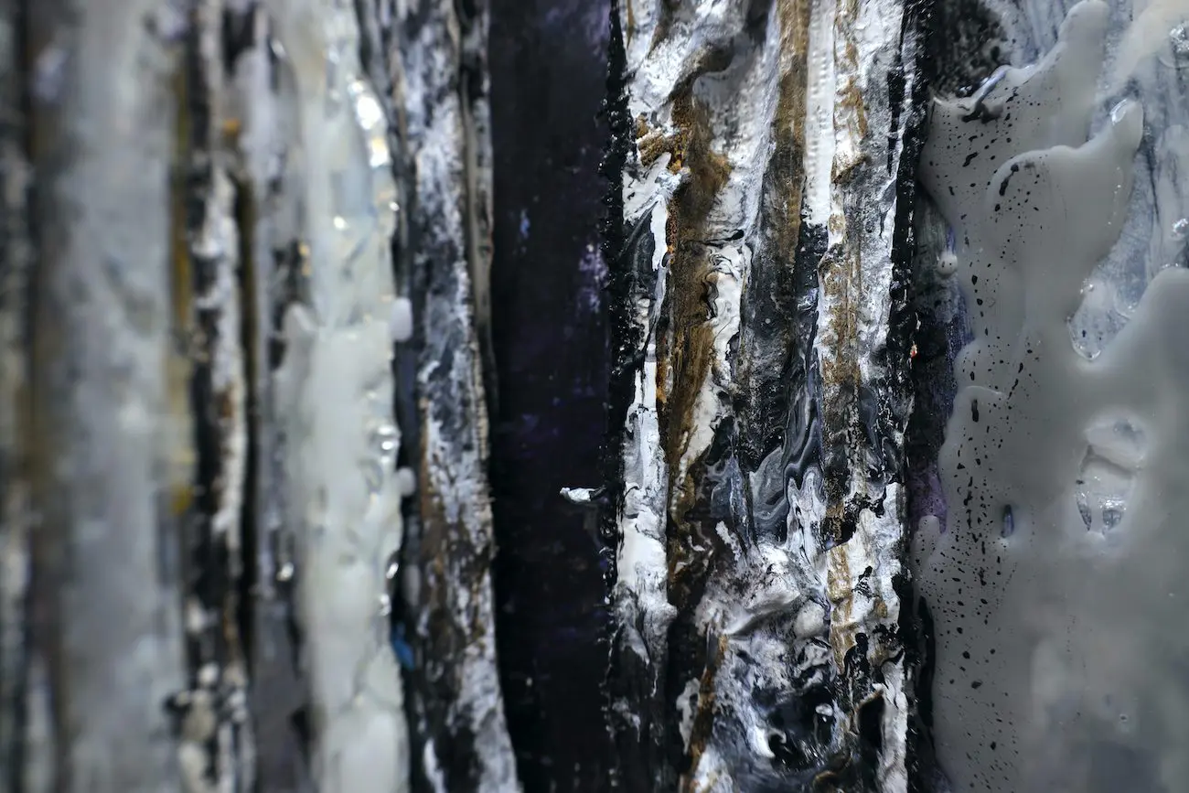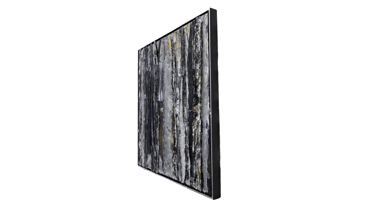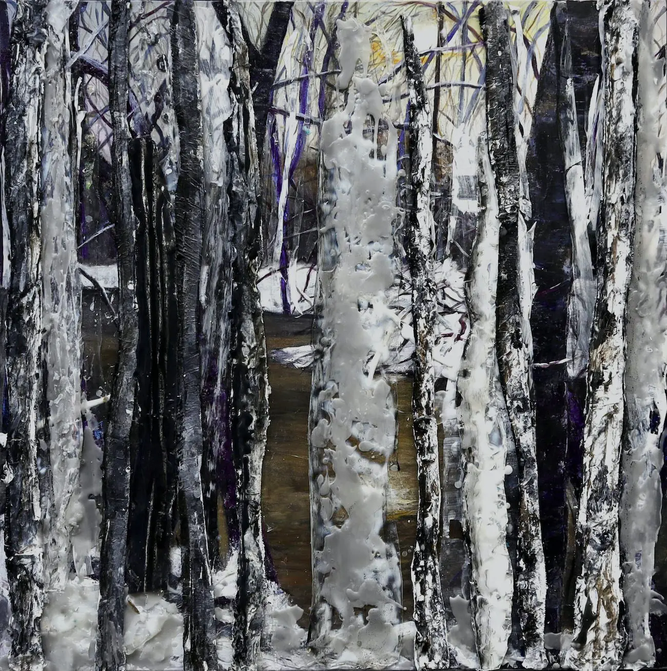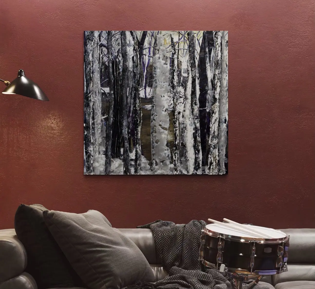 Haleh Mashian’s “Whispers of Winter” captures the quiet beauty of a snow-covered forest through rich textures and layered contrasts. Stark black and white tree trunks stand tall against a subdued winter landscape, their surfaces coated in thick, sculptural applications of paint that mimic the weight of freshly fallen snow.