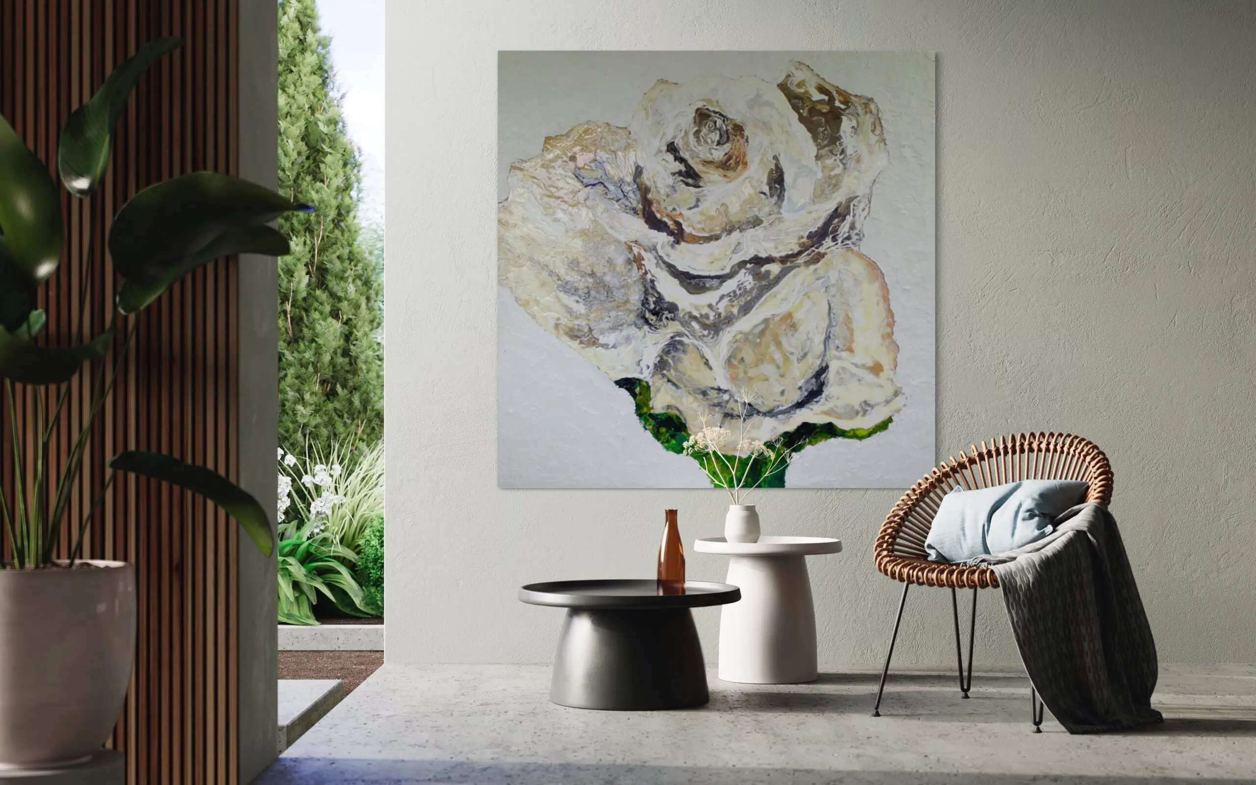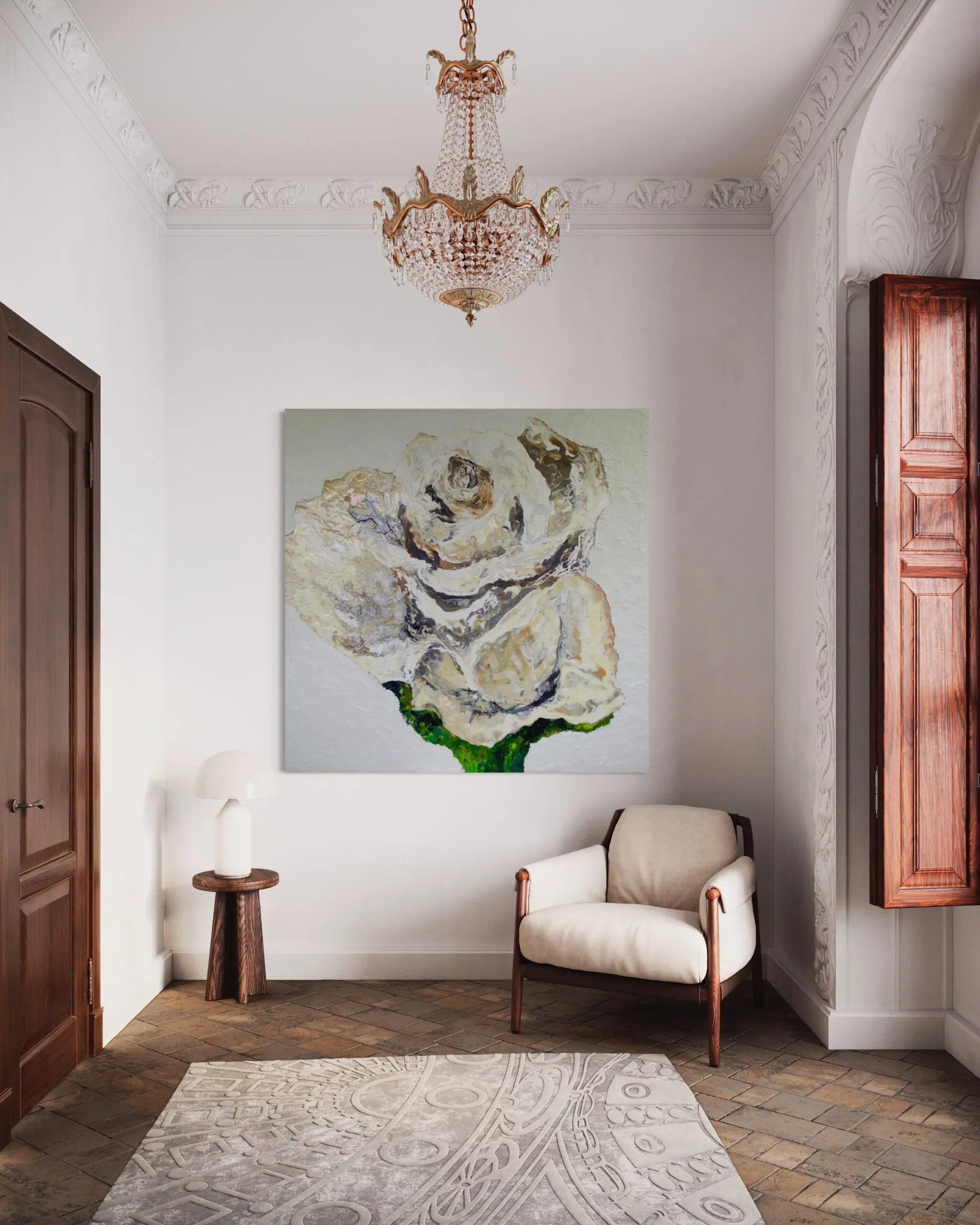 “White Rose” carries a fascinating tension between abstraction and representation. The expressive, almost geological textures give the flower an undeniable weight, yet they also challenge the traditional softness associated with a rose. For collectors and interior designers looking for contemporary artwork that merges floral beauty with bold, textural expression, “White Rose” is a stunning choice that bridges elegance with strength.