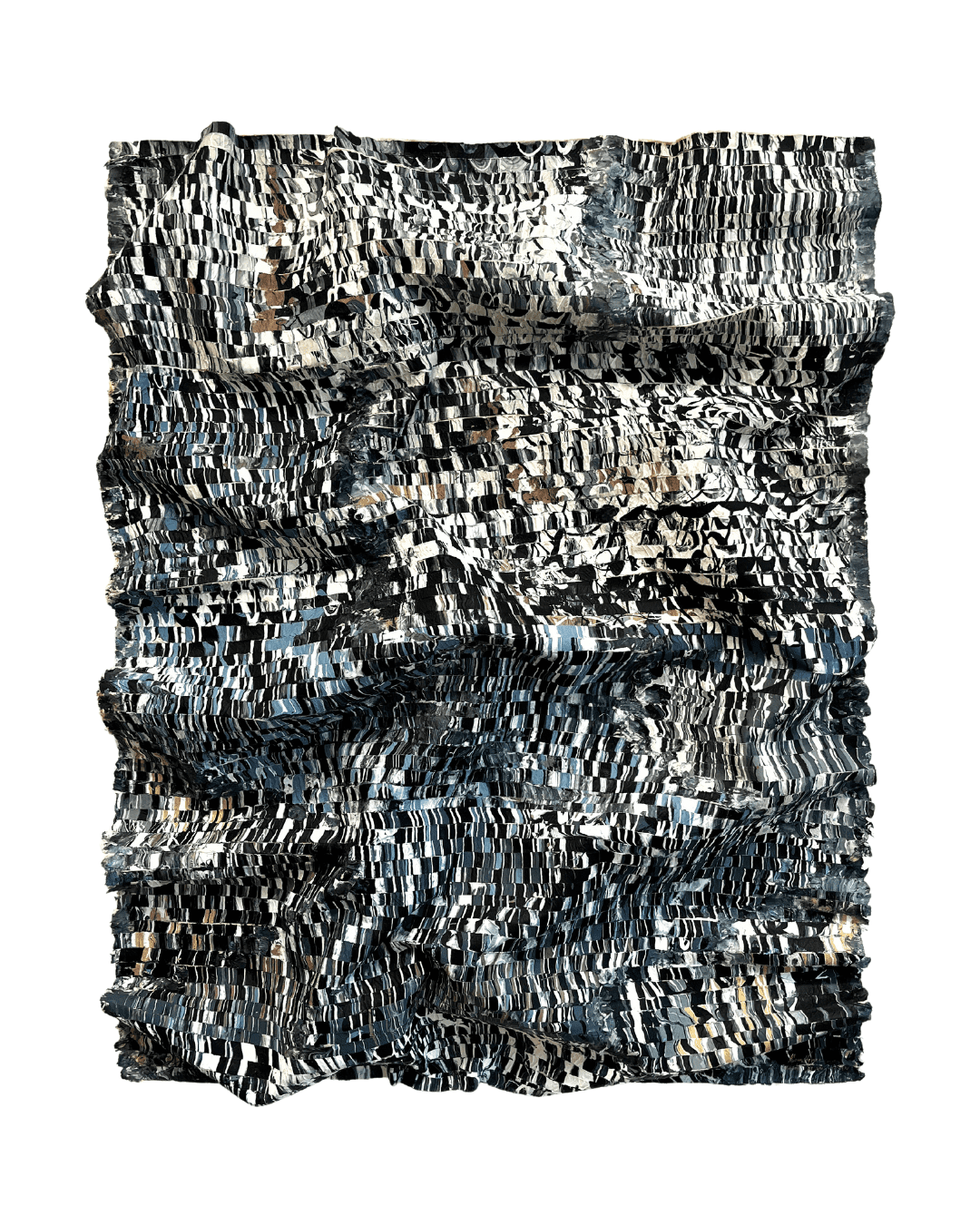 Nguyen creates what he calls “deconstructed paintings,” large, bold works that are comprised of hundreds of silk strips, which he cuts, paints, and meticulously applies onto canvas. The pieces may be hung in different iterations: sculpturally on the wall with undulations or flat, stretched like a painting on bars or behind glass.