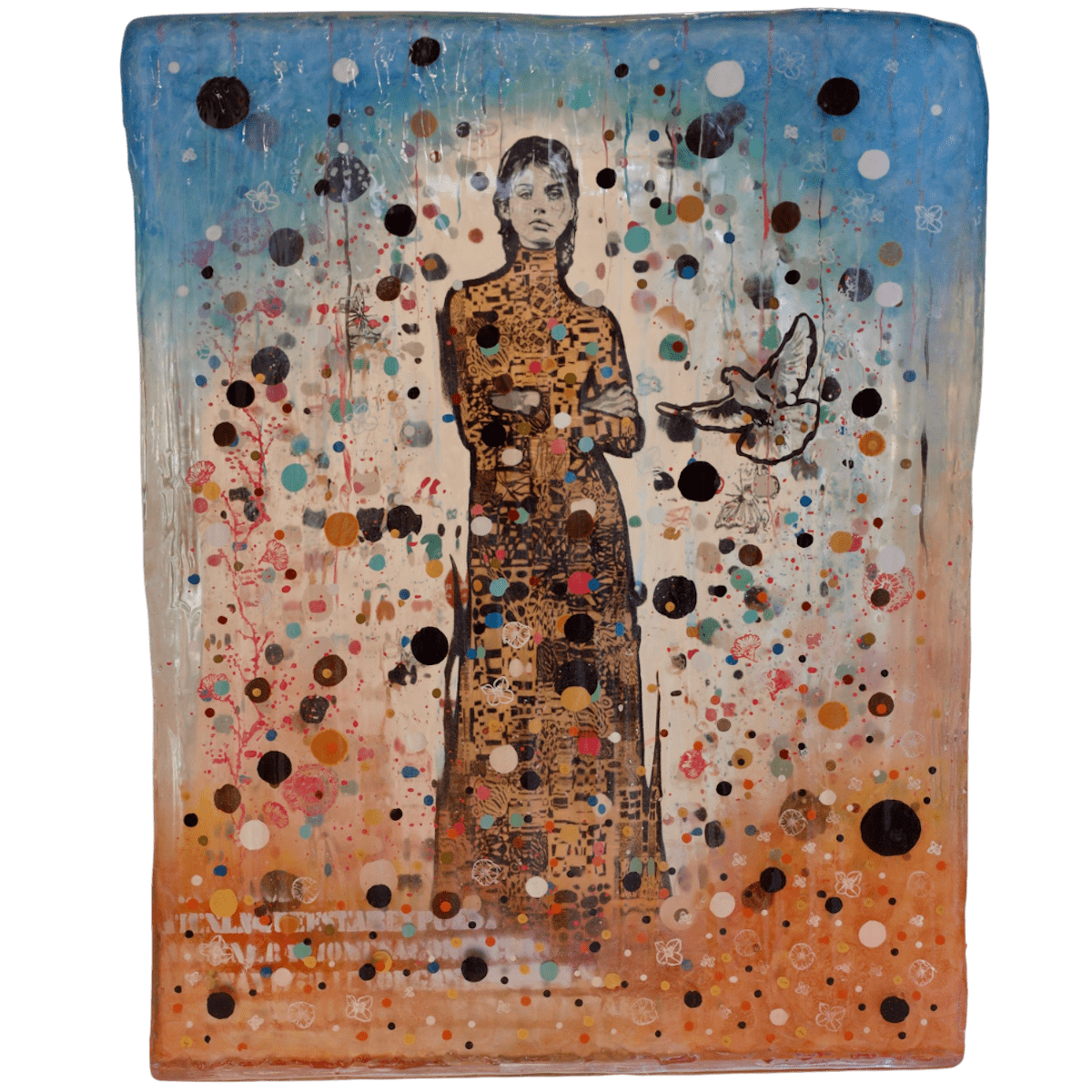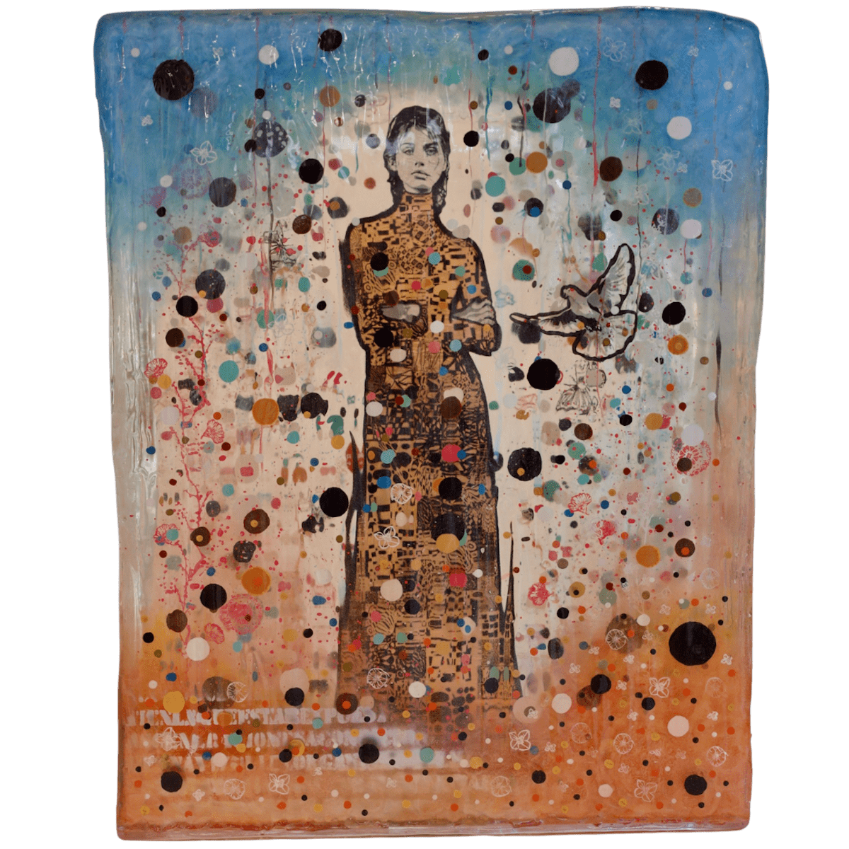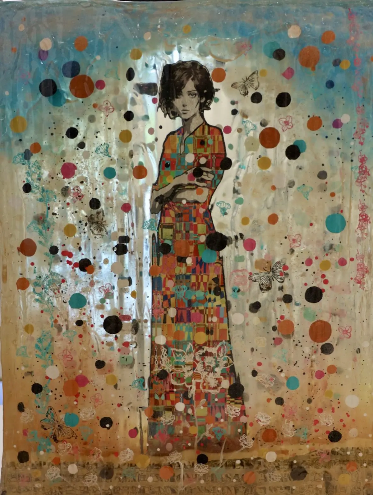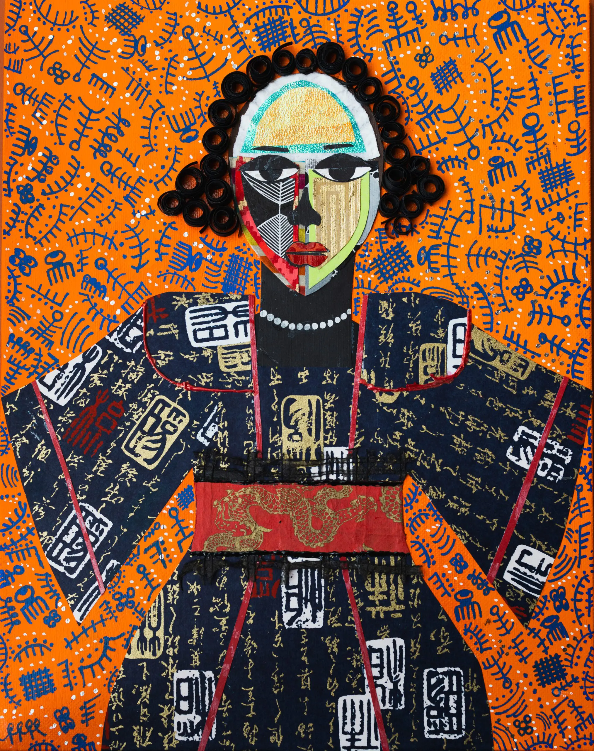 Lola Okunola is an award winning mixed media artist who has created and sold art pieces all over the world. Through her paintings and mixed media projects, she seeks to examine the nuances and complexities of identity. Her vibrant and colorful pieces are made of materials such as paper, leather, fabrics, paint, and mediums to create texture and 3D effects. Her artwork is often inspired by traditional African and Asian culture and fashion, which she combines with modern techniques to create pieces that evoke a deep emotional journey.