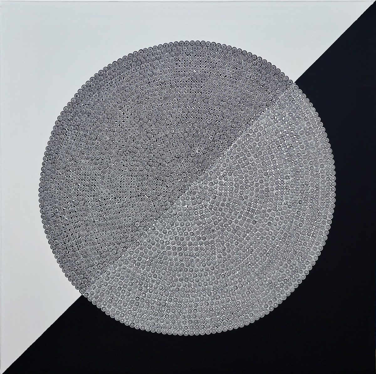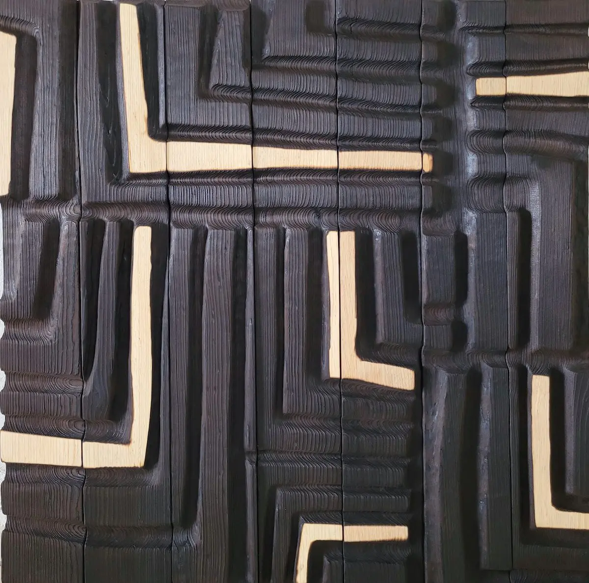 As an Istanbul-born artist, Didem Yagci was deeply inspired by the late Victor Vasarely, who created abstract works based on optical illusion and geometry, as well as FrankStella, whose textured works express his masterful use of color. Didem Yagci’s wooden sculptures form kinetical patterns that express notions of creation, infinity, and eternity. Working with wood, her method presents layered delicate pieces she sands by hand placed together to create three-dimensional canvases with richly textured, impasto-like surfaces.