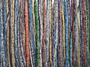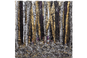 Mashian’s sculptural relief portrays colorful forest that are fully articulated and layered creating a visual phenomena that alternately appear in sharp relief or recede into the depth of landscape.