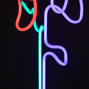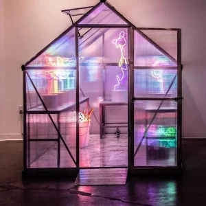 “The Neon Queen,” Lisa Schulte, presents a site-specific installation, “Color Fields,” a three-dimensional greenhouse with abstract neon flowers, tools, and icons. Lisa shares, “When one enters the greenhouse, my intention is to convey a feeling of peace and serenity and enchantment.”