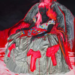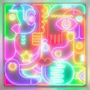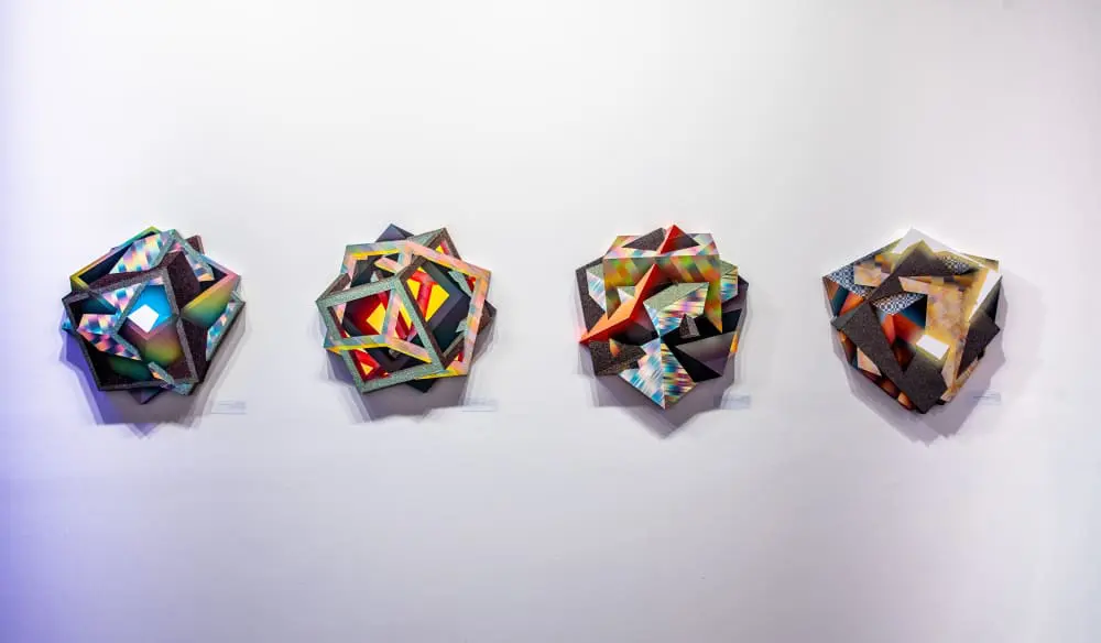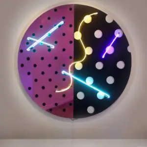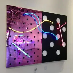 Serbian light artist, Marko Gavrilovic, presents an intricate series of suspended plexiglass sculptures in an ongoing series titled, “Sharks.” Illuminated multi-colored shapes intertwine with light, conversely meshing Geometric Abstraction with Light Art. Marko shares, “I explore the possibilities in which nature and built environments will coexist…” The theme of color as illusion continues with Angela Johal’s geometric pattern paintings, “I paint with striped diagonal or circular bands of color which forces illusionistic spaces…” Additionally, Saskatchewan artist Laura Payne presents her “Interpolation” series made of shaped wood panels seemingly appearing three dimensional while the surface reflects, refracts and disperses light. Los Angeles artist, Aaron Axelrod melds as many mediums as possible in his work, “Painting, sculpture, photography, video art, projection mapping, experimental crystal art, mixed media neon light art…”