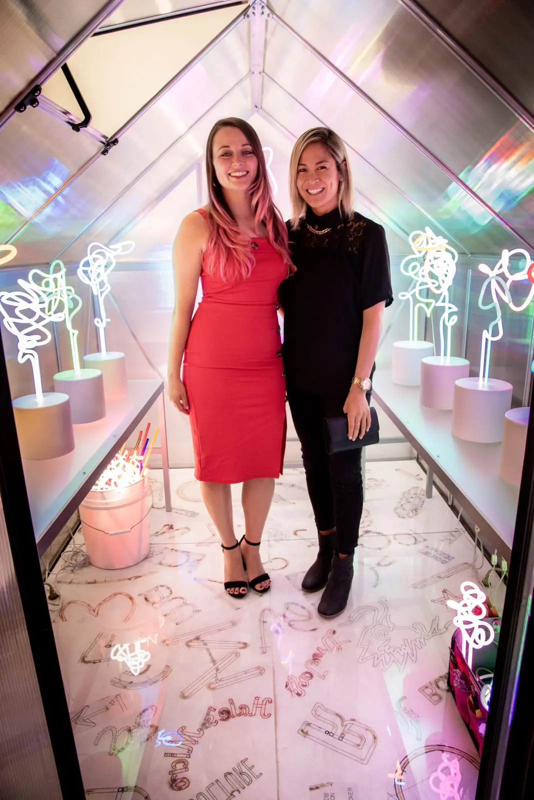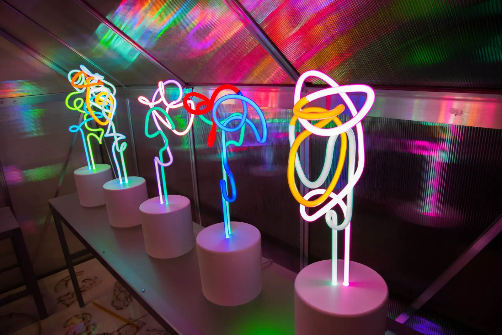 “The Neon Queen,” Lisa Schulte, presents a site-specific installation, “Color Fields,” a three-dimensional greenhouse with abstract neon flowers, tools, and icons. Lisa shares, “When one enters the greenhouse, my intention is to convey a feeling of peace and serenity and enchantment.”