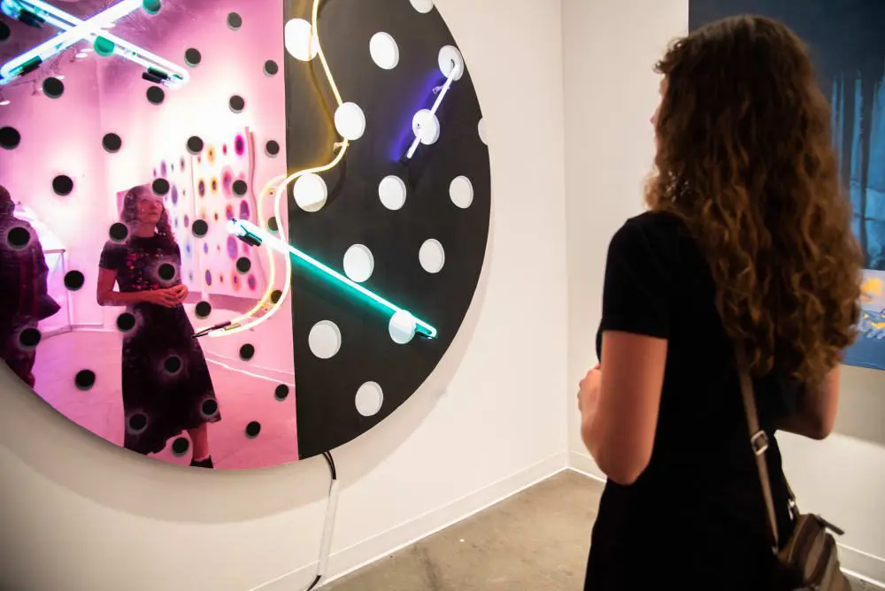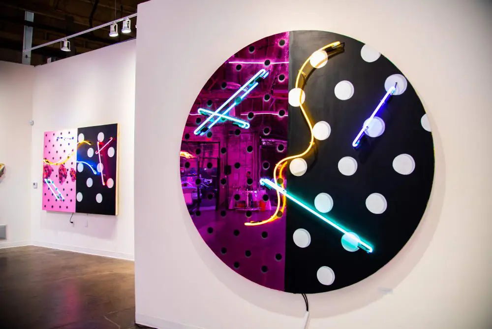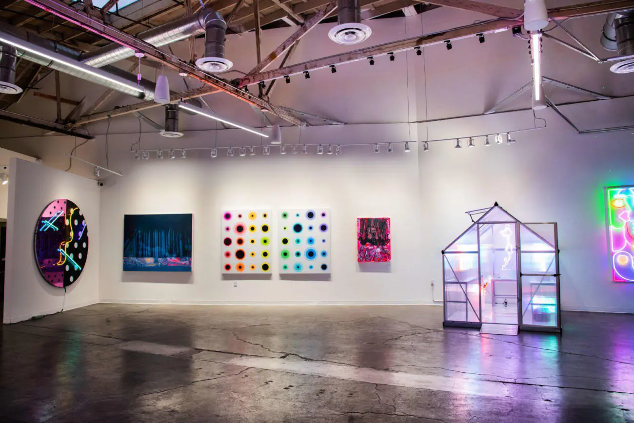 Curated by Haleh Mashian, LUMEN presents the viewer with a multi-sensory showcase that is both ethereal and atmospheric, yet geometric and analytic. Work ranges from the two-dimensional, painted canvases, to three-dimensional works composed of alternative materials, plastics, glass, and metal. “The Neon Queen,” Lisa Schulte, presents a site-specific installation, “Color Fields,” a three-dimensional greenhouse with abstract neon flowers, tools, and icons. Lisa shares, “When one enters the greenhouse, my intention is to convey a feeling of peace and serenity and enchantment.”