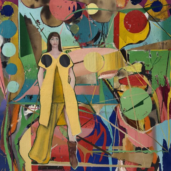 Justin Price’s canvases radiate energy and playful complexity, blending geometric abstraction, fashion, and figuration. His works, whether layering a Rick Owens–clad figure into a whirlwind of color or patchworking faces and forms into fields of texture, balance chaos and control. They remind us that delight often arises from tension—from the push and pull of melancholy and joy, spontaneity and structure.