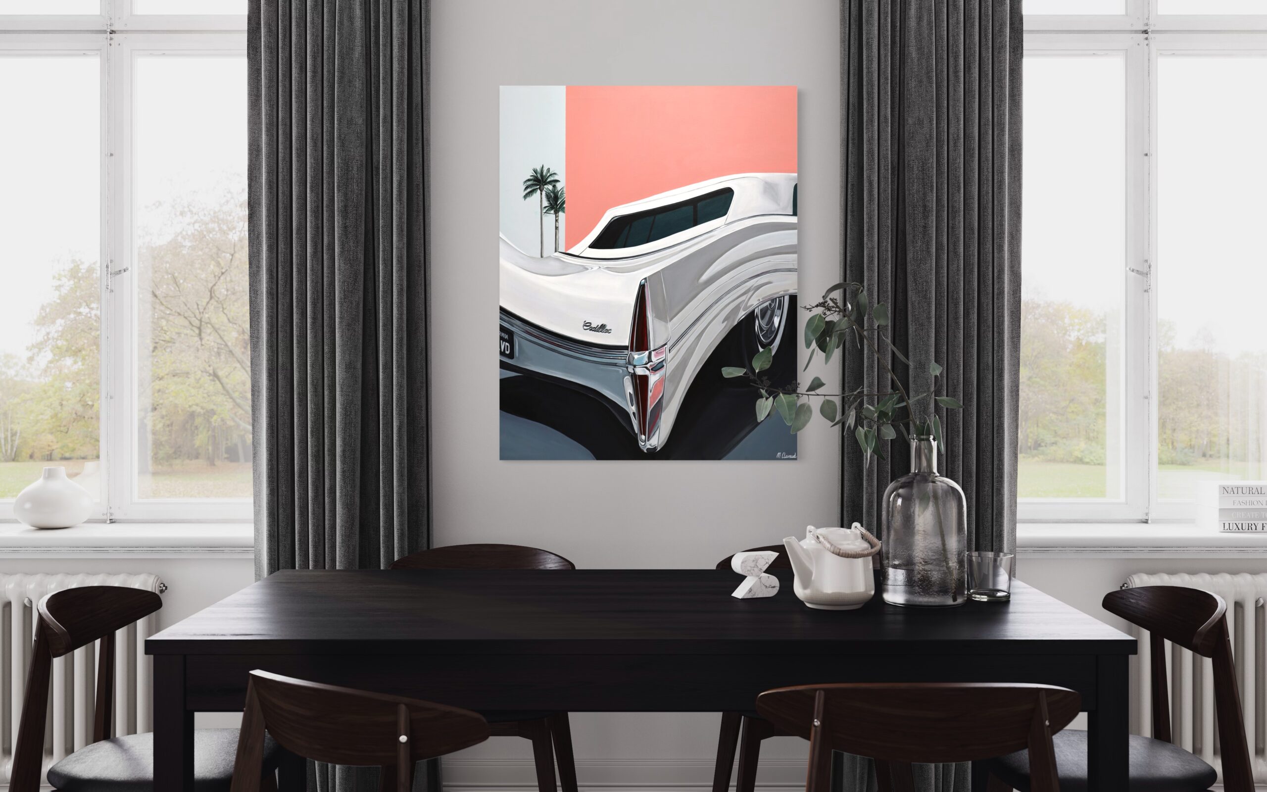 Their art reveals a fascination with detail and a passion for capturing the hidden beauty in everyday objects. By transforming mundane elements into poetic expressions, the artist invites viewers to reconsider the familiar, encouraging a dialogue between the ordinary and the extraordinary. This meticulous focus on detail is complemented by their varied subject matter, from California-inspired retro themes to the sleek elegance of vintage Cadillacs. Works such as Jungle Cadi immerse the viewer in an enigmatic atmosphere, juxtaposing the reflective body of a Cadillac with a dark, vegetal background, while Fluid Cadi reinterprets travel memories through surreal distortions that blur the line between dream and reality.