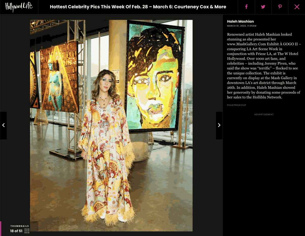 Renowned artist Haleh Mashian looked stunning as she presented her www.MashGallery.Com Exhibit À GOGO II – conquering LA Art Scene Week in conjunction with Frieze LA, at The W Hotel Hollywood. Over 1000 art fans, and celebrities – including Jeremy Piven, who said the show was “terrific” – flocked to see the unique collection. The exhibit is currently on display at the Mash Gallery in downtown LA’s art district through March 26th. In addition, Haleh Mashian showed her generosity by donating some proceeds of her sales to the Holliblu Network.