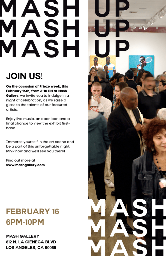 On the occasion of Frieze week, this February 16th, from 6-10 PM at Mash Gallery, we invite you to indulge in a night of celebration, as we raise a glass to the talents of our featured artists. Enjoy live music, an open bar, and a final chance to view the exhibit first-hand.