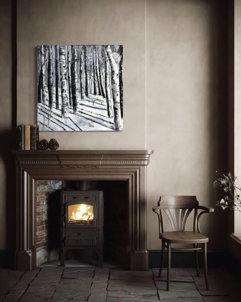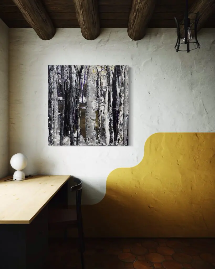 Neutral wall art like Icelandic Glow perfectly feeds into the aesthetic narrative of the space–a hearty fire, a frigid yet homey forest… Keeping it minimal allows a room’s overall vibe to shine through more than you may think.