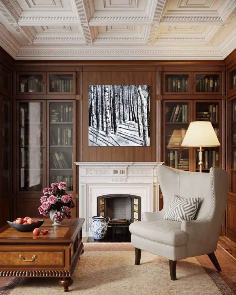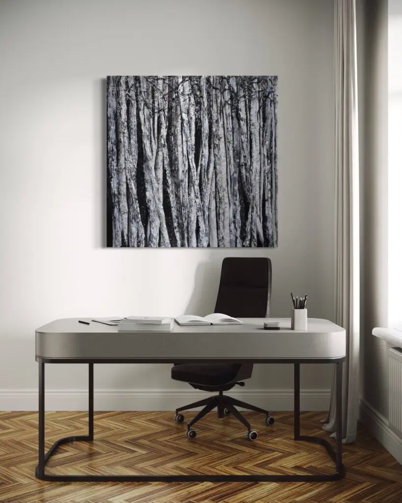 One of the most popular types of neutral wall décor is the grayscale painting. Think that sounds boring? Monochromatic pieces are anything but. They convey depth, emotion, and contrast–vivid colors aren’t needed. Black and white art is especially popular in luxury home interior design, and sleek office spaces, where understated elegance is key. Whether it’s a detailed portrait, abstract pattern, or a landscape, grayscale pieces bring a modern touch to any space.