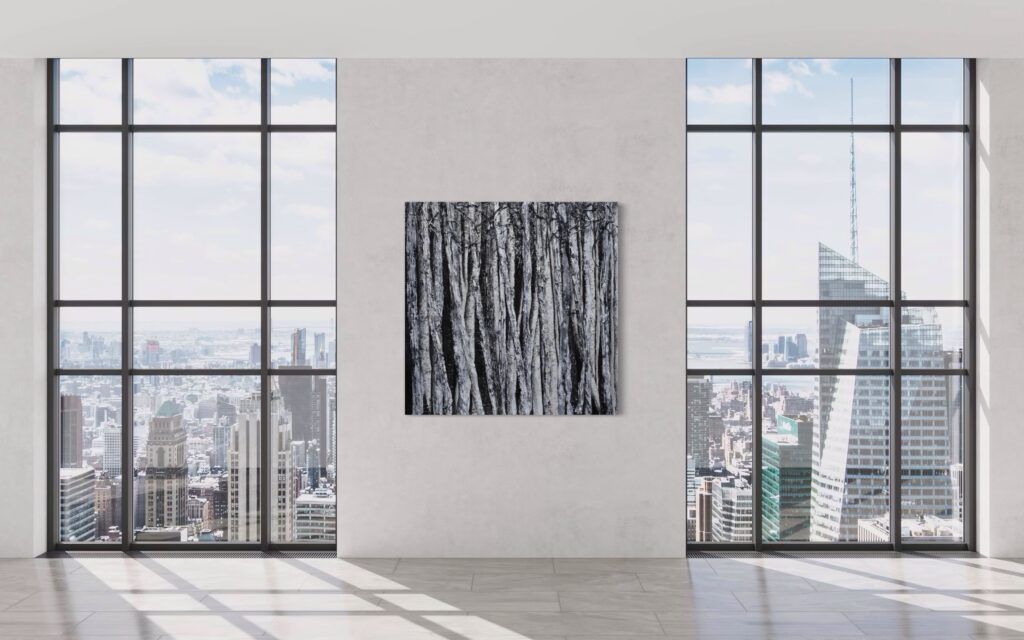 One of the most popular types of neutral wall décor is the grayscale painting. Think that sounds boring? Monochromatic pieces are anything but. They convey depth, emotion, and contrast–vivid colors aren’t needed. Black and white art is especially popular in luxury home interior design, and sleek office spaces, where understated elegance is key. Whether it’s a detailed portrait, abstract pattern, or a landscape, grayscale pieces bring a modern touch to any space.