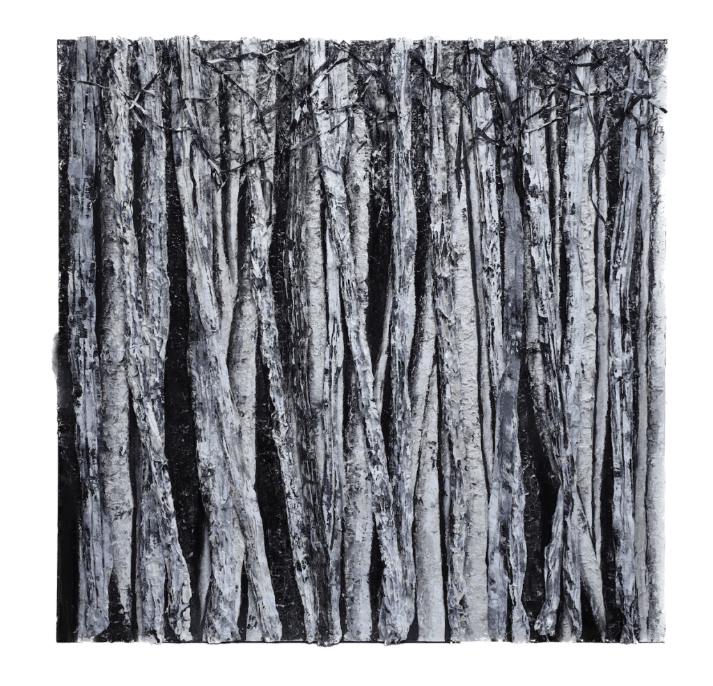 Intertwined In Moonlight showcases tightly arranged, overlapping black and white barks, generating a rich, layered texture that immediately pulls the viewer into the scene. Predominantly dark tones from the background create a striking 3D effect, evoking the impression of a vast, lush forest.