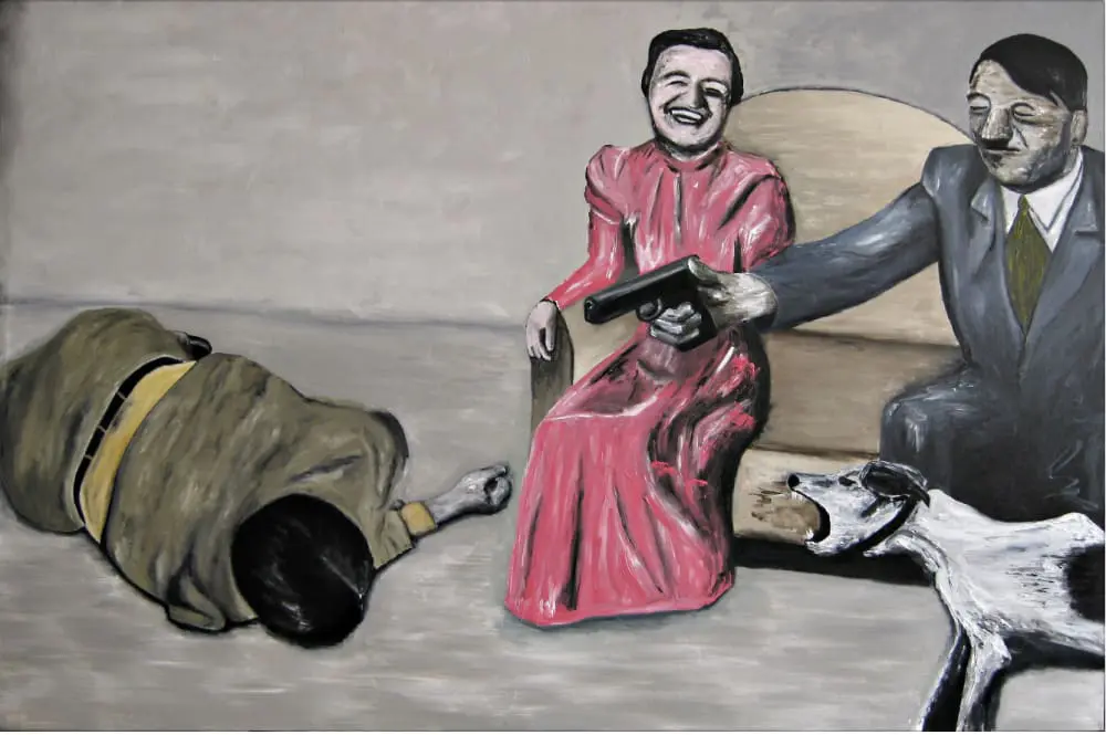 The past and the present, and perhaps even the future, appear to merge in many of Hassett’s paintings. In Woman Pisses Herself, as an example, Hitler sits with a woman who could be his mistress, Eva Braun. On the table in front of them is a baby that the Führer prods with a needle. The image suggests the horrendous human experiments conducted by the Nazis. The child becomes nothing more than an object of fascination, and the entire image is devoid of color except for the bright garish pink of the woman’s dress. One now cannot help but associate the image of a pink dress with tragedy as in Jacqueline Kennedy on that fateful day in Dallas in 1963. Again, there is the conflation of history and tragedy, of past and present, of a narrative that sadly is as topical now as it was in 1940s Nazi Germany.